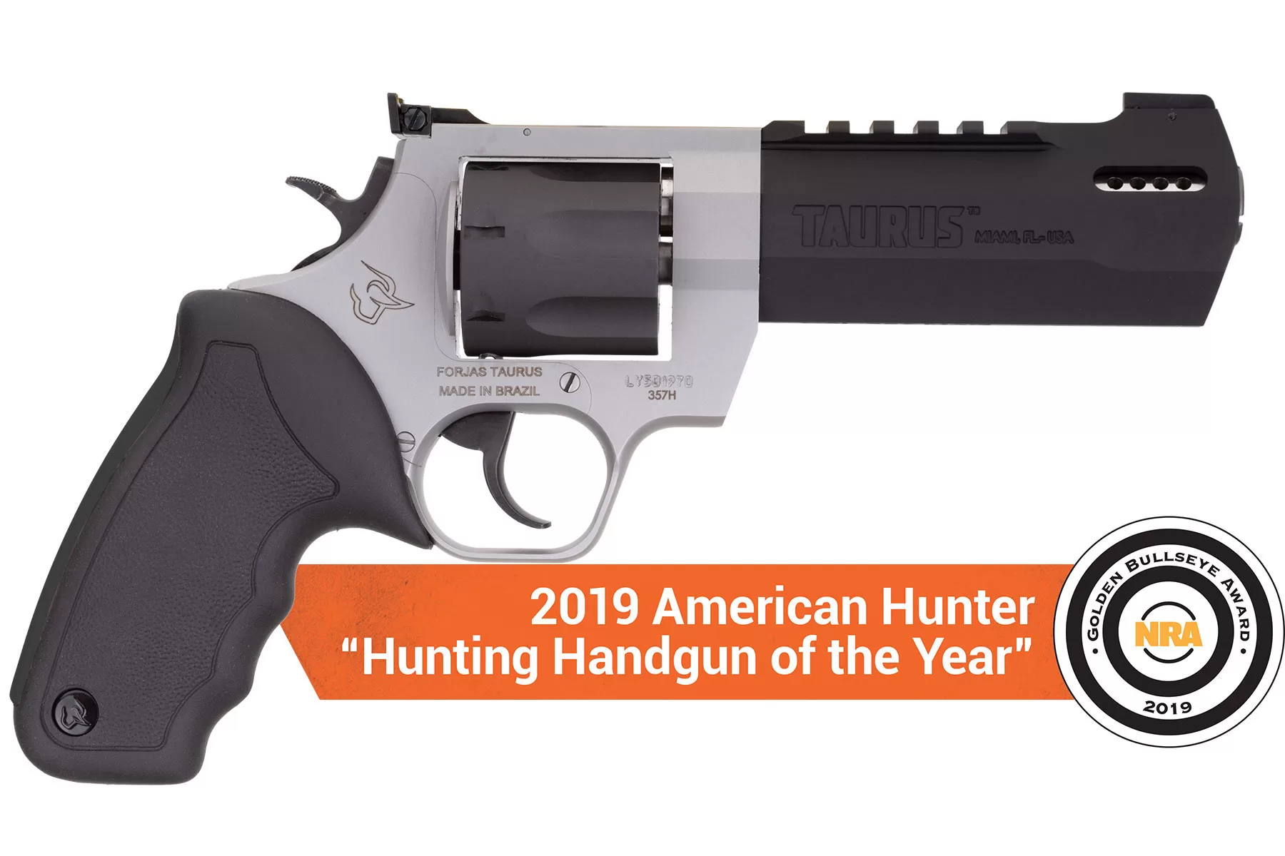 Winner of the 2019 American Hunter Handgun of the Year Golden Bullseye Award, the Taurus Raging Hunter is a next-generation, big-bore revolver that’s first in innovation-and built to last. A fun and effective alternative for short- to medium-range hunting scenarios, this 357 Magnum, seven-shot revolver is available in Matte Black or Two Tone finish. Its revolutionary angular barrel design cuts down on overall weight, while its factory tuned porting and gas expansion chamber reduces muzzle lift for quicker target acquisition. Cushioned insert grips ensure a comfortable, controllable shooting experience.