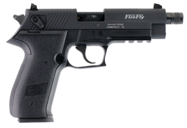 The GSG FireFly features a wear-resistant alloy frame outfitted with an integrated accessory rail. The slide has an adjustable rear sight, and along with the rugged blowback system, fixed barrel and superior ergonomic grip, the GSG FireFly delivers exceptional accuracy. Safeties include an internal locking device and slide-mounted ambidextrous safety. This model has a 4″ threaded steel barrel and a black metal finish.
